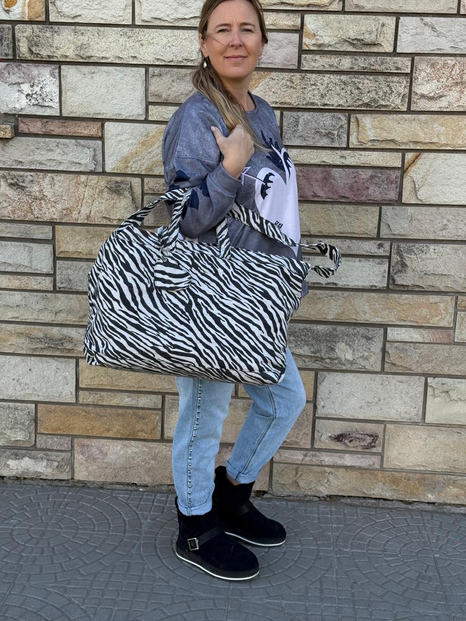 Maxi bolso de diseño moderno con estampado animal print en blanco y negro, ideal para sumar personalidad y estilo a cualquier look. Su formato amplio lo convierte en el aliado perfecto para el día a día, permitiendo llevar todo lo que necesitás de manera cómoda y práctica. Cuenta con doble manija resistente para un transporte seguro y confortable, y un diseño liviano pero funcional que se adapta tanto a looks urbanos como casuales. Su estética llamativa lo transforma en una pieza protagonista, perfecta para quienes buscan accesorios con actitud y tendencia. Ideal para uso diario, salidas, viajes cortos o jornadas largas, combinando estilo y practicidad en un solo bolso.