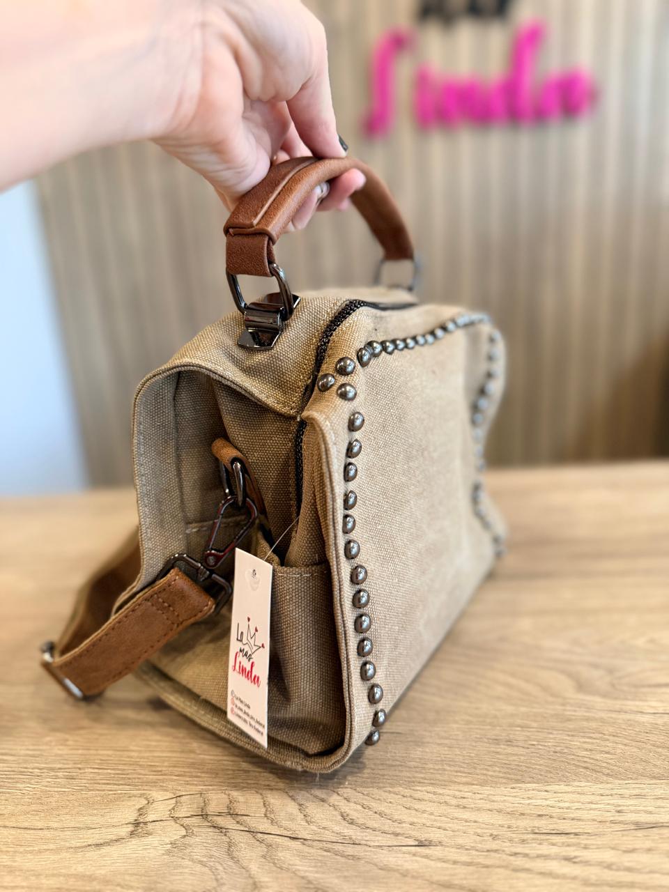 Bandolera de Lona con Tachas – Estilo Urbano Chic Bandolera confeccionada en lona resistente de alta calidad, ideal para quienes buscan un accesorio práctico sin resignar estilo. Su diseño en tono beige se realza con tachas metálicas decorativas en el contorno frontal, que aportan un look moderno y sofisticado. Cuenta con un compartimento principal con cierre, perfecto para llevar tus esenciales de forma segura. Incorpora asa corta símil cuero para llevar en la mano y correa larga ajustable y desmontable, permitiendo usarla como bandolera o bolso de mano según la ocasión. Un diseño compacto, versátil y elegante, ideal para el uso diario, salidas o eventos casuales. medidas: 23cmx16cmx10cm