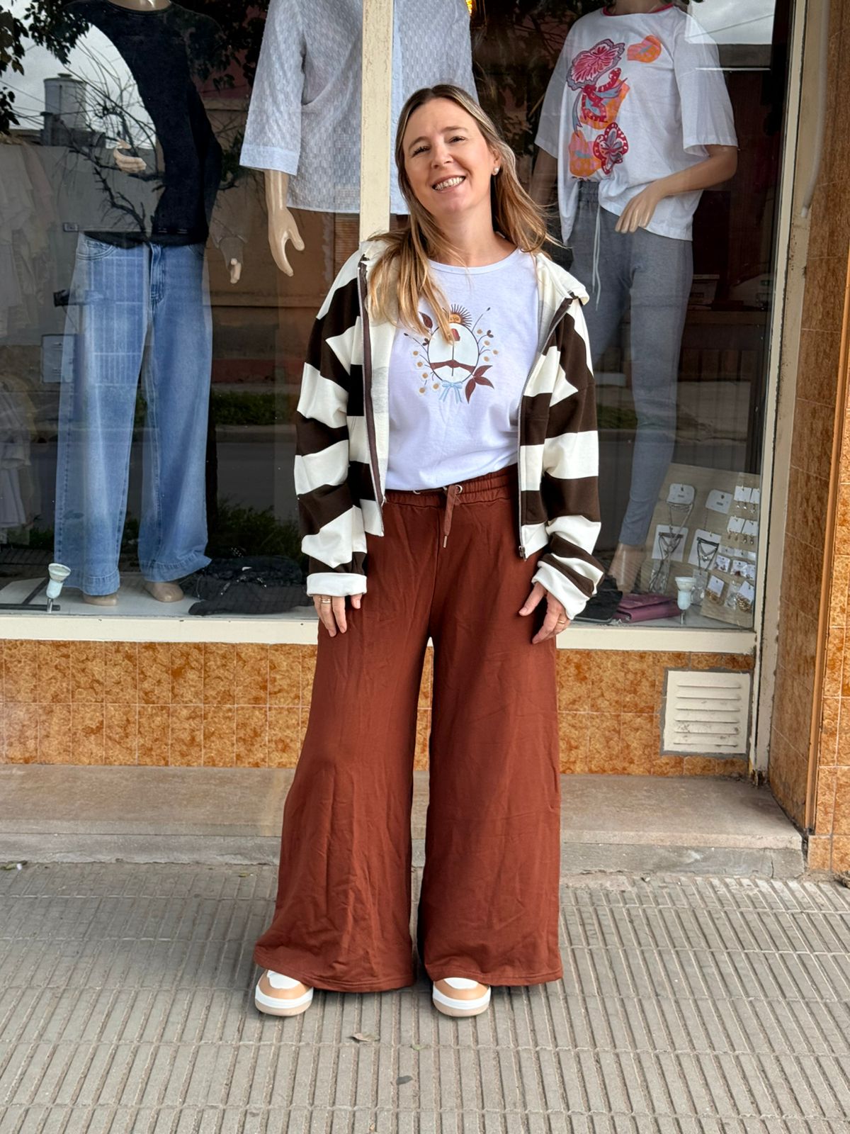 Nuestro pantalón palazzo es sinónimo de comodidad y estilo en una sola prenda. De tiro alto con cintura elastizada y lazo regulable, se adapta perfecto al cuerpo realzando la figura sin ajustar. Su calce amplio y fluido aporta movimiento y frescura, ideal para esos días en los que querés sentirte cómoda pero súper canchera. La tela liviana y suave lo convierte en una opción perfecta para usar todo el día, desde un look relajado hasta una salida más armada. Su tono cálido y versátil combina con todo: remeras básicas, camisas o sweaters, logrando outfits modernos sin esfuerzo. ✨ Un palazzo que te va a acompañar en todos tus planes, con ese equilibrio perfecto entre relax y estilo. medidas Talle 2 cintura (sin estirar el elástico) 30 cm cadera 56 cm largo 98 cm Talle 3 cintura (sin estirar el elástico) 32 cm cadera 58 cm largo 100 cm Talle 4 cintura (sin estirar el elástico) 34 cm cadera 60 cm largo 105 cm