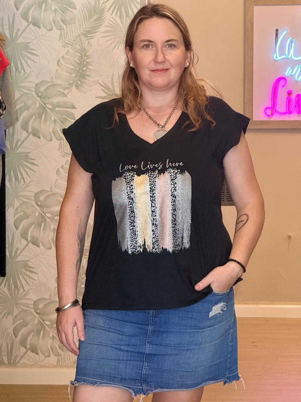 Remera negra de manga corta con diseño moderno y calce cómodo. Confeccionada en tela suave y liviana, ideal para el uso diario. En el frente presenta la frase “Love Lives Here” acompañada por un diseño artístico de pinceladas verticales en tonos neutros y suaves, que aportan textura visual y un estilo actual. Una combinación perfecta entre mensaje y diseño minimalista. Su corte relajado y mangas amplias la convierten en una prenda versátil, fácil de combinar con jeans, faldas o pantalones para lograr looks urbanos y cancheros.