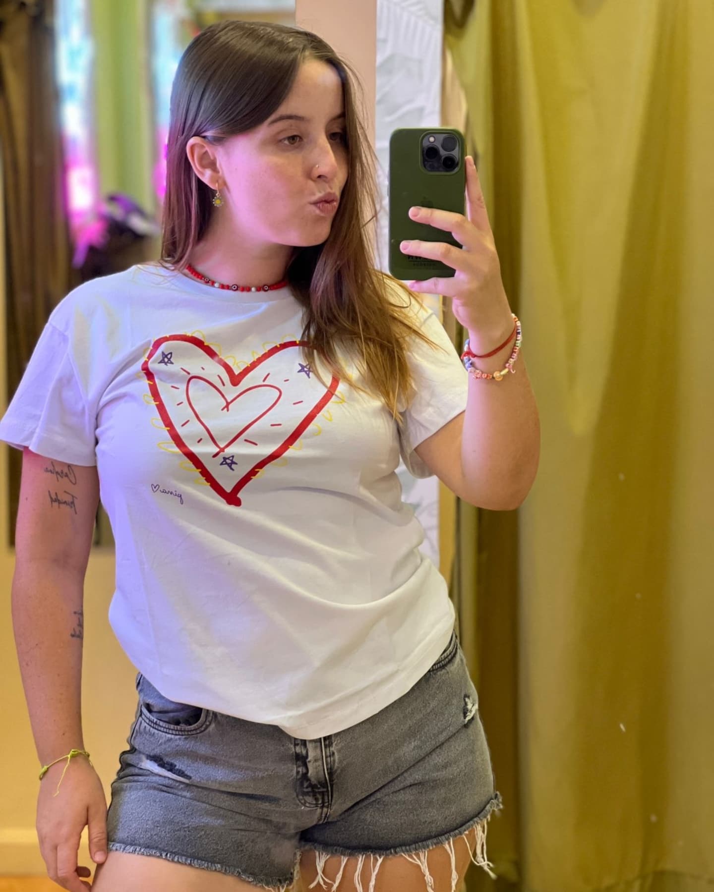 Remera blanca de calce cómodo y clásico, confeccionada en tela suave y liviana, ideal para el uso diario. Presenta una estampa frontal de corazón doble, realizada en tonos rojo, amarillo y violeta, con un diseño artístico y alegre que aporta personalidad y un toque juvenil. Su cuello redondo y mangas cortas la convierten en una prenda versátil, fácil de combinar con shorts, jeans o faldas. Perfecta para looks casuales, frescos y relajados, tanto de día como de noche. ✨ Simple, canchera y llena de color ✨