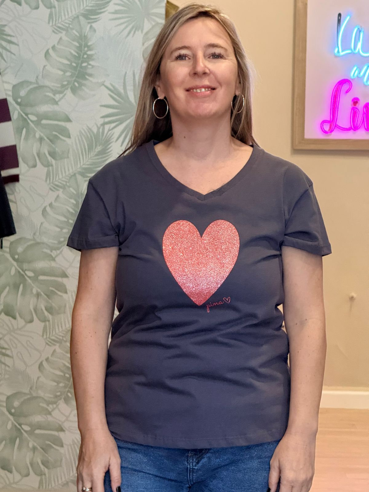 Remera en tono gris oscuro, de corte clásico y calce cómodo, confeccionada en tela suave y liviana para un uso diario confortable. Presenta una estampa frontal de corazón con efecto glitter, que aporta brillo sutil y un toque femenino sin perder sobriedad. Su escote en V estiliza el cuello y realza la silueta, convirtiéndola en una prenda versátil y fácil de combinar. Ideal para looks casuales con jeans o pantalones, perfecta tanto para el día como para una salida relajada. ✨ Clásica, femenina y con un detalle que enamora ✨