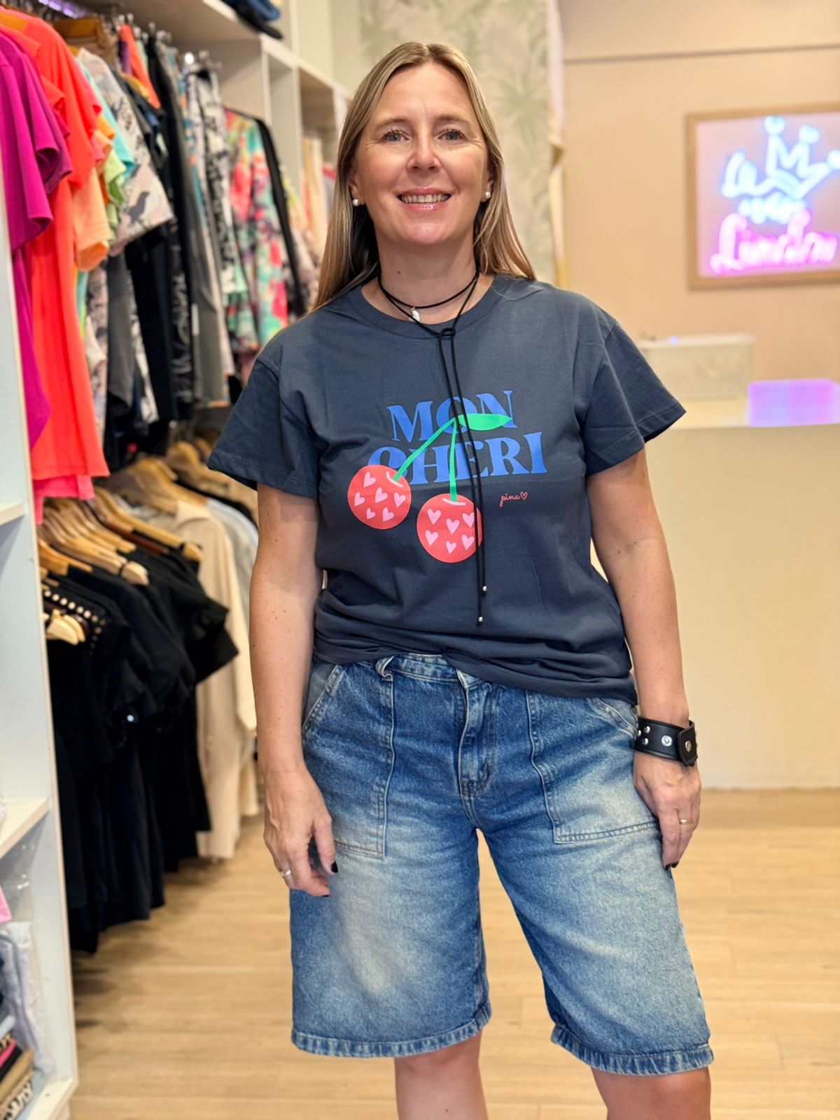 Un diseño divertido y con mucha personalidad. Nuestra remera “Mon Chéri” combina estilo urbano con un toque romántico, perfecta para looks relajados pero con onda. Confeccionada en algodón suave y cómodo, presenta base en tono azul oscuro que resalta su estampa frontal: tipografía “MON CHÉRI” en azul vibrante acompañada de dos cerezas rojas con pequeños corazones en su interior. Un detalle original que le da frescura y un aire moderno.